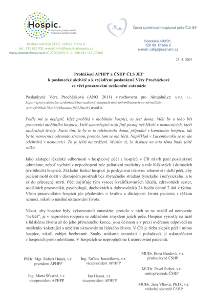 "Názor, aby hospice byly vykonavateli eutanázie, protože v nich se na rozdíl od nemocnic “neléčí”, je v naprostém rozporu se základním smyslem jejich péče. Hospice vyrostly na úctě k lidskému životu až do jeho přirozeného konce, jsou účinnou a v praxi ověřenou odpovědí na myšlenky koketující s umělým ukracováním lidského života. V ČR je třeba zlepšit péči i mimo hospice, nikoli zabíjet bezbranné. Snahy uzákonit eutanázii i požadavek ji uskutečňovat v hospicích proto odmítáme. V hospicích se nepropůjčíme k usmrcování pacientů."