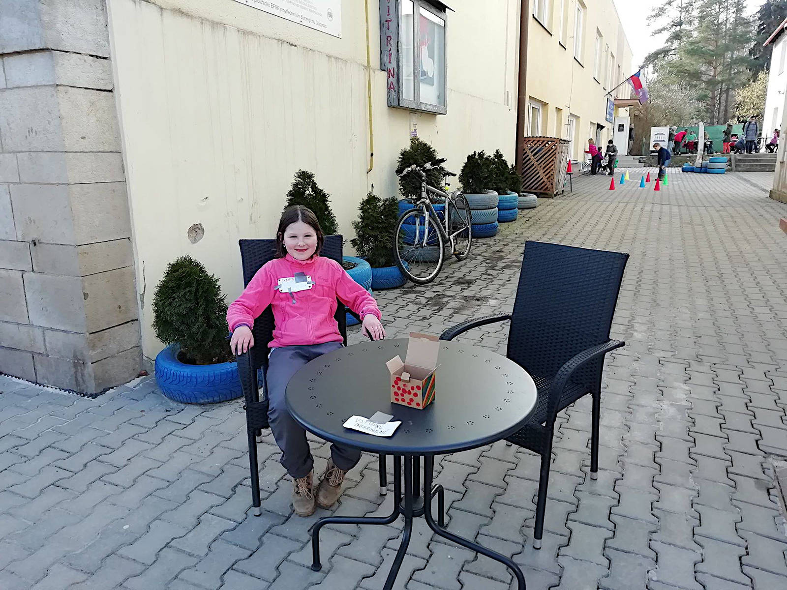 A skutečně začali přicházet rodiče a kolemjdoucí, lidé s pozvánkami v ruce a všichni přispívali do kasiček, zakousli si skvělý koláč nebo muffin, hodili si míčkem na plechovky nebo proběhli s míčem slalom mezi kužely. Během hodiny, kdy probíhal bazar a hry, dokázaly děti vybrat 1.143,- Kč.